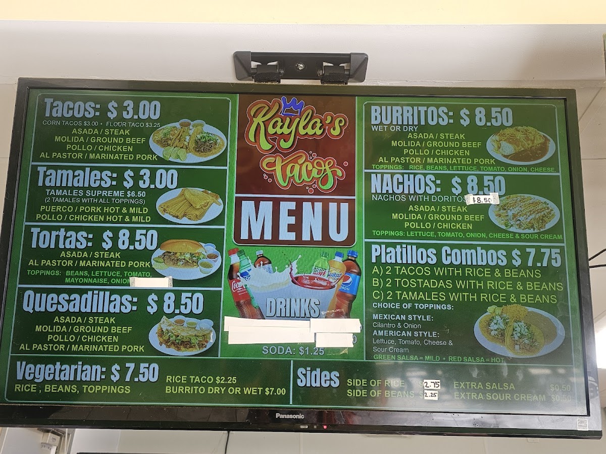 Kayla’s Tacos offers a straightforward and inviting menu focused on classic taco fare and casual comfort food. Its selection feels like a friendly neighborhood spot where simple, satisfying meals come together with familiar flavors and uncomplicated presentation.
